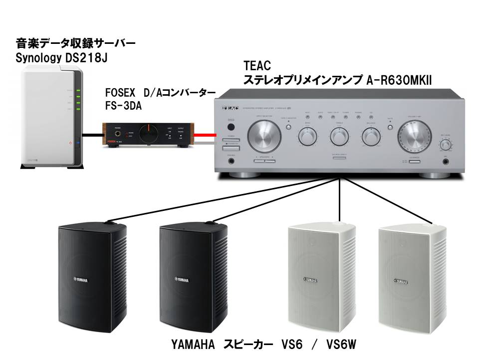 synologyのNASを音楽配信サーバとして使用し、D/Aコンバーターを介してアンプに接続する弊社独自のユニークな構成です。